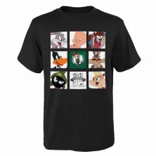 Camiseta de manga corta para entrenar de Space Jam y con el escudo de los Celtics, prenda de Outerstuff, marca con licencia para la ropa Space Jam para niños y junior, con logos de la película y del equipo NBA serigrafiados al frente.