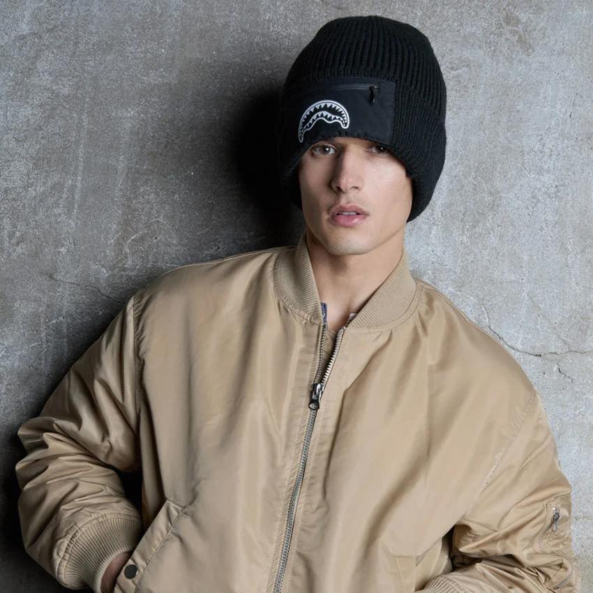 Gorro Sprayground black pocket. Gorro con pompón de la marca de moda en el mundo entero, la marca del tiburón